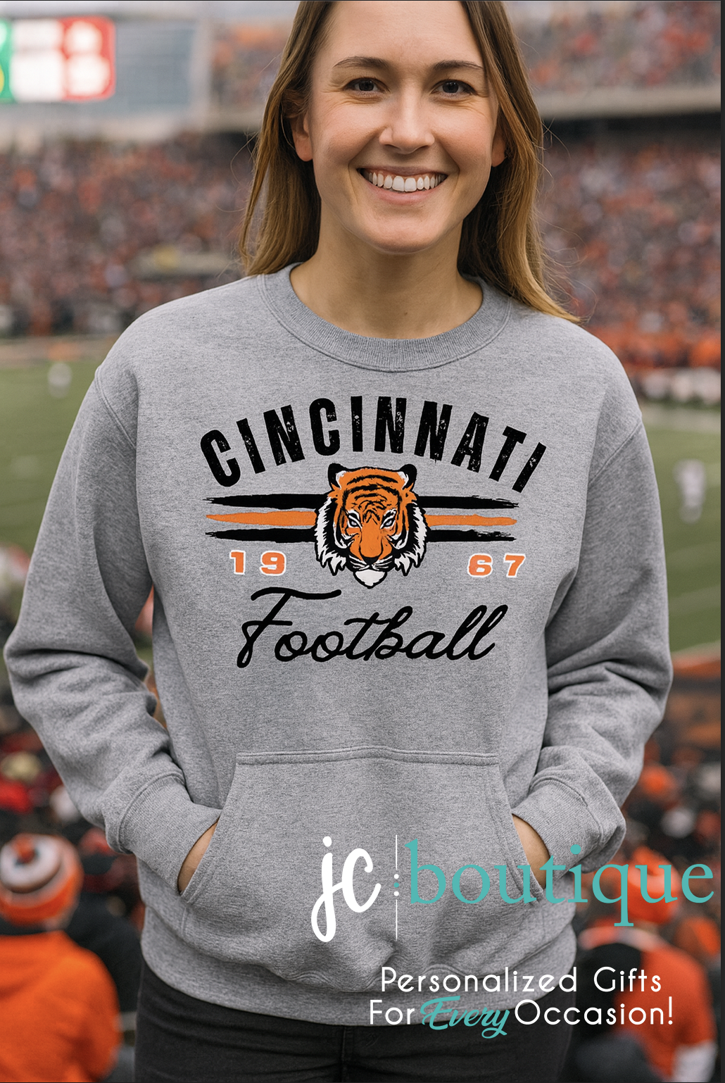 Show your team spirit in style with this classic Cincinnati Football crewneck sweatshirt. Featuring a bold tiger graphic, vintage-inspired lettering, and the year 1967 proudly displayed, this design celebrates Cincinnati’s football heritage. The soft, mid-weight fleece offers all-day comfort, while the kangaroo pocket adds both function and warmth—perfect for tailgates, game days, or casual wear. Pair it with jeans or joggers for a timeless game-day look.