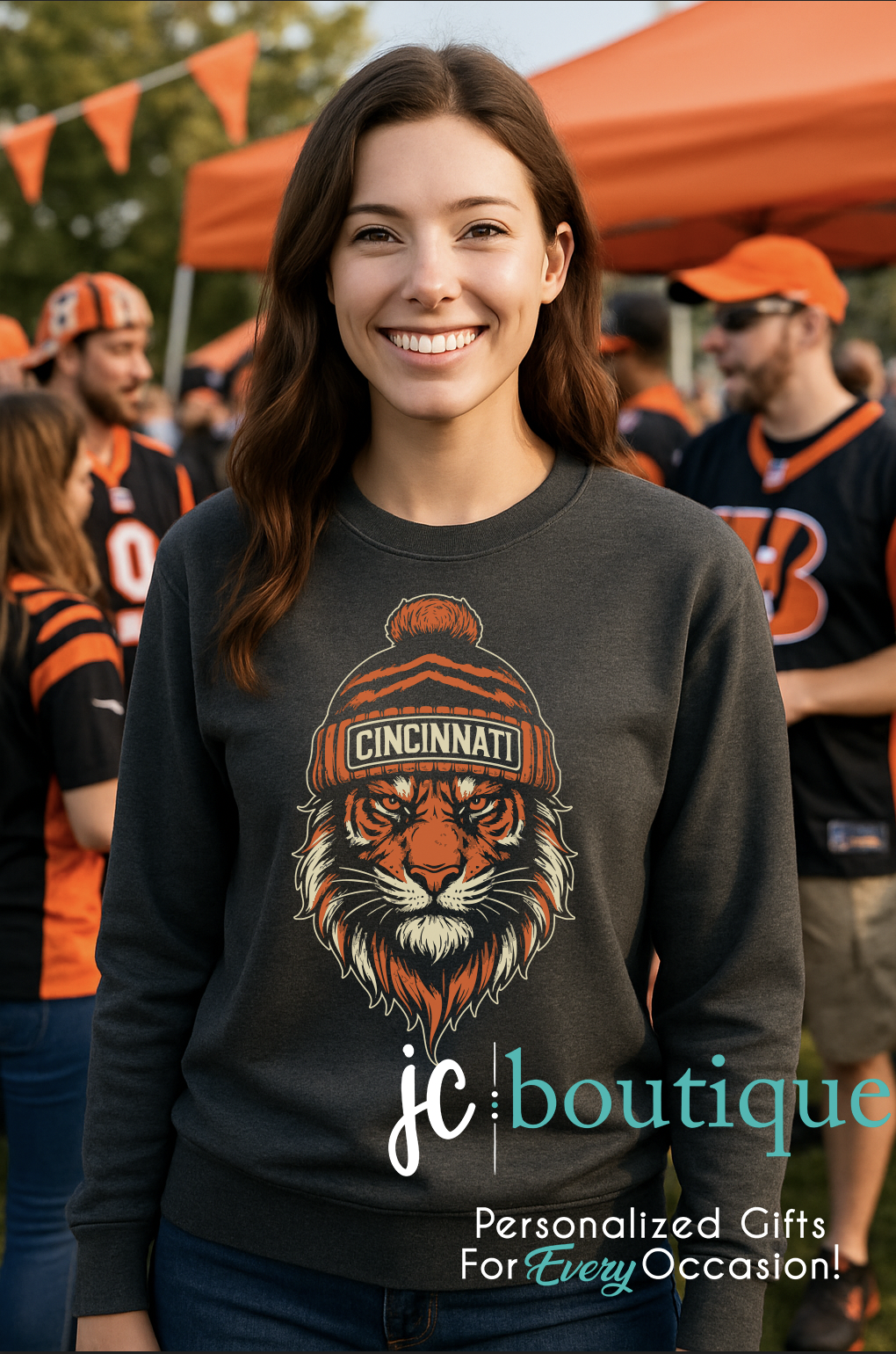 Show off your city pride and team spirit in style with our Cincinnati Tiger Beanie Crewneck! Featuring a bold, detailed tiger illustration sporting a cozy beanie that proudly reads Cincinnati, this sweatshirt is the perfect mix of fierce and festive.