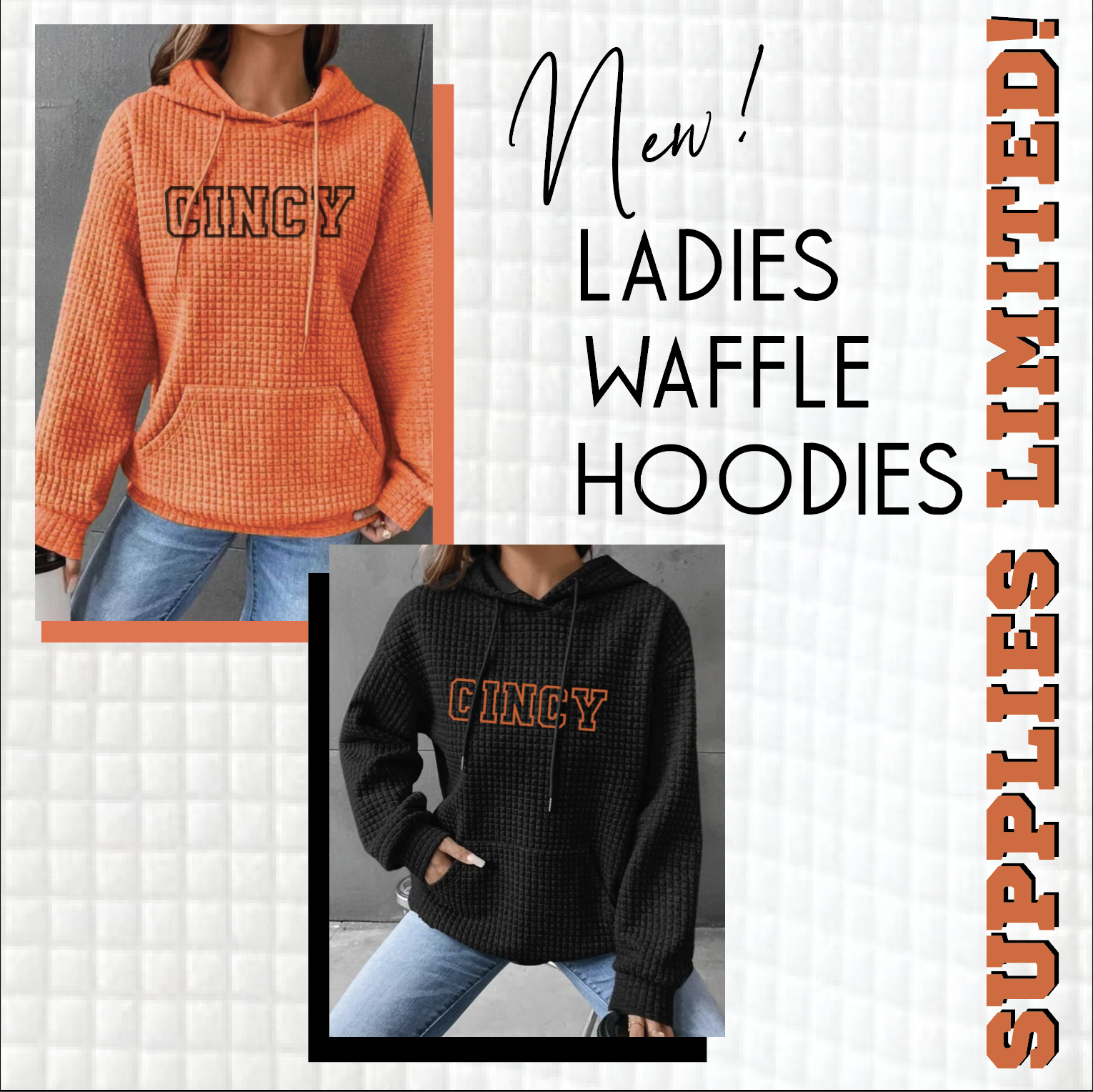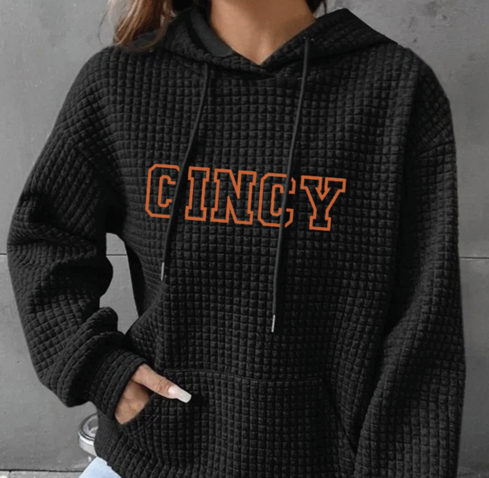 Show off your hometown pride in cozy, elevated style with our CINCY Embroidered Waffle Knit Hoodie. Featuring bold varsity-style lettering across a rich textured waffle fabric, this hoodie is the perfect blend of comfort and spirit.