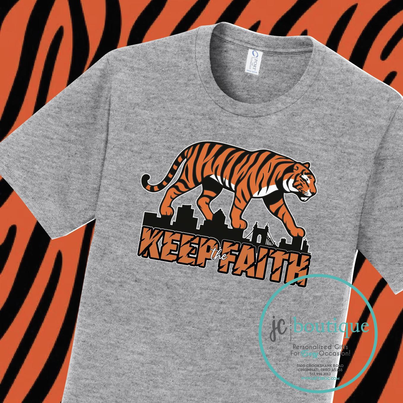 Show your stripes and stand strong with the Keep The Faith Tee – a bold design for die-hard Cincinnati fans. Featuring a prowling Bengal tiger over the city skyline, this shirt reminds us all to keep believing, no matter what the season brings.