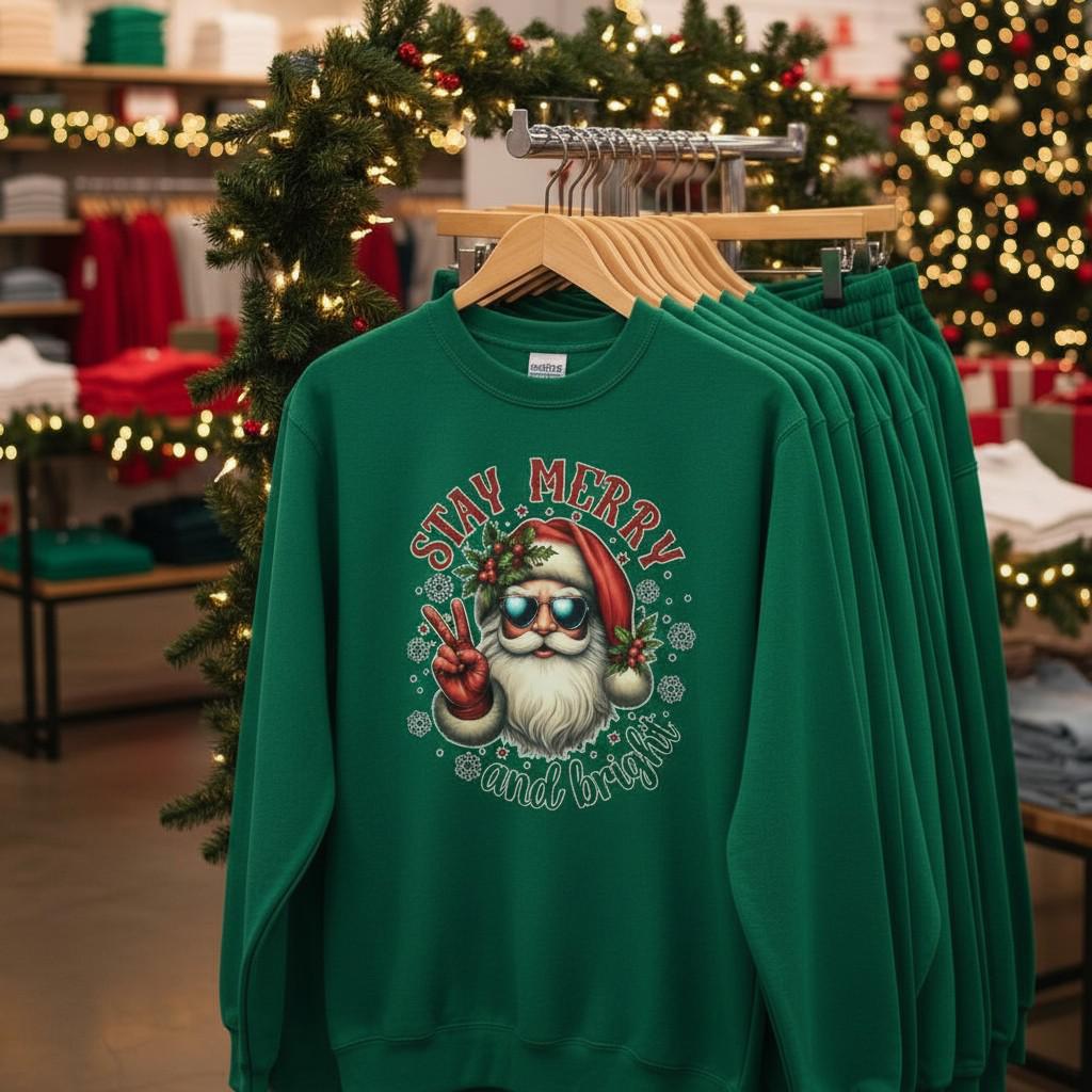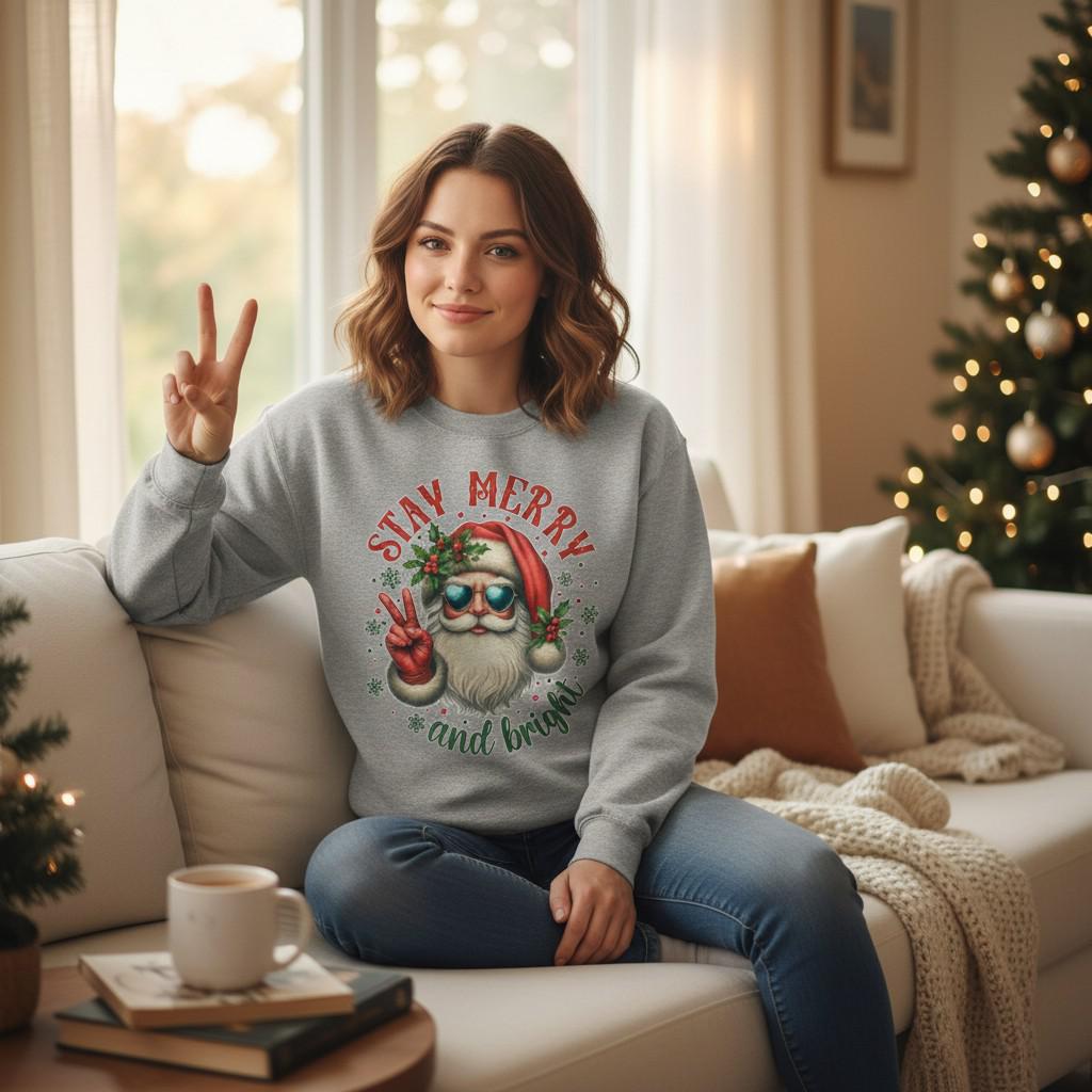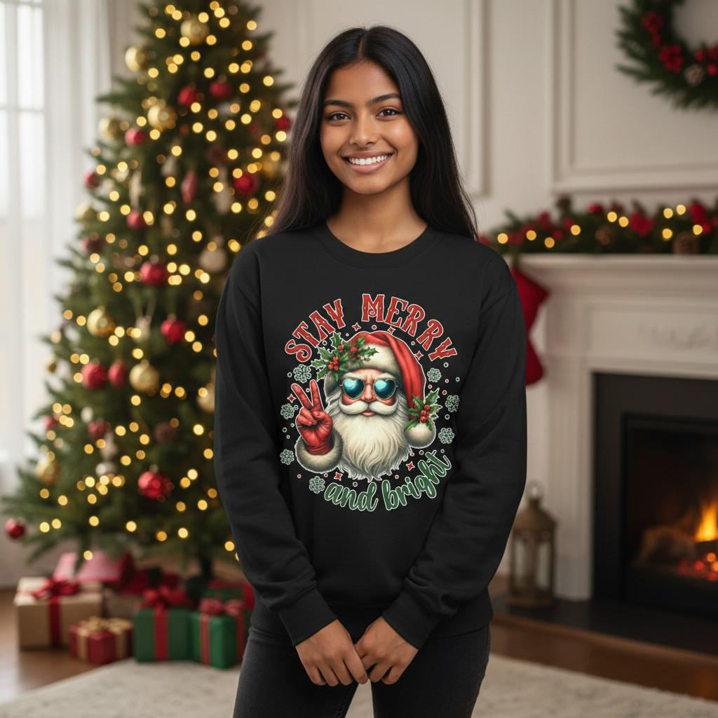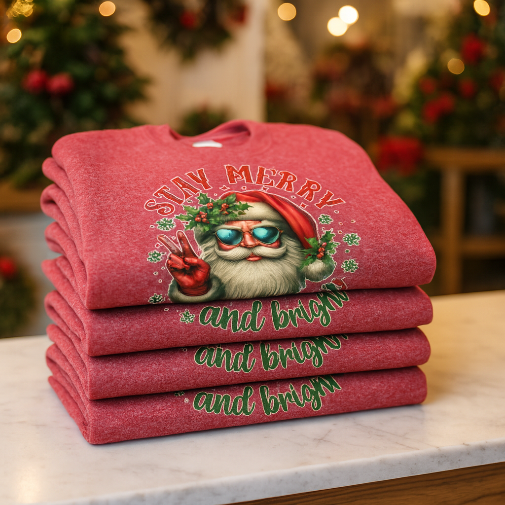 Our “Stay Merry and Bright” Santa Sweatshirt features a chill Santa flashing the peace sign, rocking sunglasses and holly details, surrounded by snowflakes and festive lettering. It’s the perfect throw-on for tree trimming, shopping, movie marathons, and every holiday get-together in between.
